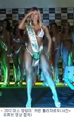 지난달 30일 브라질 상파울루 한 호텔에서 진행된 '2012 미스 엉덩이 선발대회' 최종 무대에서 카린 펠리자르두(29)가 다른 최종 진출자들을 누르고 우승을 차지했다.