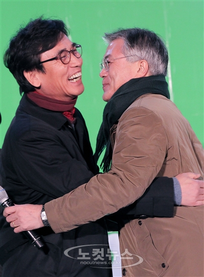 문재인 민주통합당 대통령 후보가 3일 오후 서울 종로구 세종문화회관 앞에서 열린 '서울시민과 광화문 콘서트 춥다! 문 열어!'에 참석해 유시민 진보정의당 전 의원과 포옹하고 있다.
