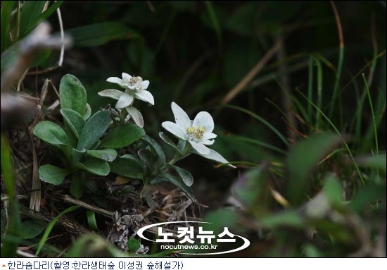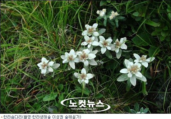 눈 덮힌 알프스하면 대부분 에델바이스를 떠올릴 것입니다. 그러나 에델바이스를 닮은 한라솜다리라고 하는 꽃이 한라산에도 있다고 하면 의아해 하는 분이 많을 지도 모르겠습니다. 그것은 쉽게 모습을 볼 수 없는 꽃이기도 하지만 우리나라에 자라는 '우리꽃' 들이 서양에서 들어온 꽃보다 잘 알려지지 않은 이유가 클 것입니다. 추위를 이겨내며 한라산의 가장 높은 곳에 자리 잡고 꽃을 피우는 한라솜다리는 들꽃의 여왕이라 해도 부족함이 없을 듯합니다. 한라솜다리는 국화과의 다년생 풀꽃으로 한라산에서만 자라는 특산식물입니다. 그래서 학명도 Leontopodium hallaisanense입니다. 개체 수뿐만 아니라 자생지도 2~3곳밖에 되지 않아 멸종위기 2급 식물로 지정될 정도로 귀한 몸입니다. 키는 다 크면 한 뼘 정도 밖에 되지 않고 검은빛을 띤 황색의 꽃을 피우는데 여름이 한창인 7월 중순에 피기 시작하여 보름 8월 초순까지도 볼 수 있습니다. 줄기 끝에 꽃이 달리고 바로 아래의 꽃잎처럼 보이는 포엽으로 둘러싸여 있습니다. 우리나라에 자라는 솜다리 종류에는 한라솜다리 외에도 설악산에 자라는 솜다리, 산솜다리와 백두대간의 소백산 이북 지역에 자라는 왜솜다리 등이 있습니다. 한라솜다리는 발을 돌리면 아찔할 정도로 가파른 백록담 절벽을 삶터로 정했습니다. 풀들이 자라기는 하지만 높은 바위가 굴곡져 있어 바람이 많고 시시각각 안개에 휩싸이기 때문에 겨울 뿐만 아니라 꽃이 피는 여름까지도 추위가 느껴지는 곳입니다. 그래서 바람의 영향을 덜 받기위해 키를 작게 하고 추위를 이기기 위해 꽃을 제외한 줄기, 잎 등 몸 전체를 흰색의 솜털로 무장했습니다. 이런 척박한 환경 속에서 오랜 세월을 견디어 내며 꽃을 피워서 그런지 한라솜다리에게서는 고상한 품격과 소박한 아름다움이 느껴집니다.