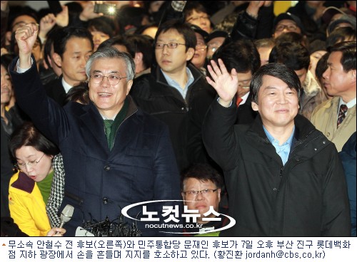 민주통합당 문재인 대선 후보와 안철수 전 후보가 합동 유세를 펼친 부산지역은 하루 종일 들썩거렸다.