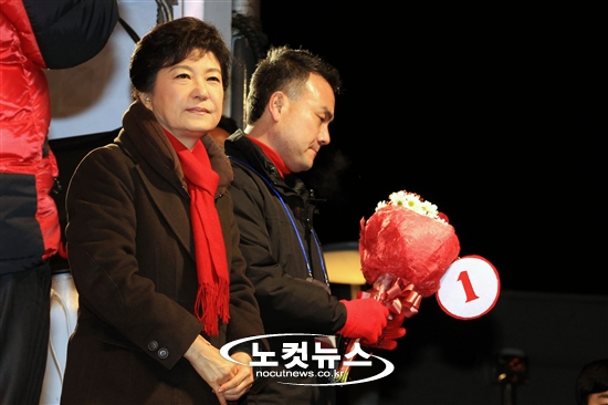 새누리당 박근혜 대선 후보가 11일 오후 서울 영등포구 타임스퀘어에서 가진 합동유세에서 지난 2일 강원 유세 수행을 위해 이동하다 교통사고로 의식불명에 빠진 김우동 홍보팀장의 사망 소식을 접하자 갖고있던 꽃다발을 수행비서에게 넘기고 두 손을 모은채 생각에 잠겨 있다.