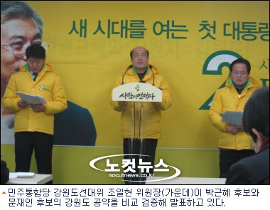 13일 민주 선대위는 민주통합당 강원도당 당사에서 박근혜, 문재인 두 후보의 강원도 공약을 비교 검증하는 기자회견을 열고 강원도민들의 현명한 선택을 촉구했다.
