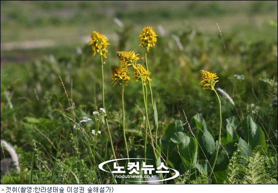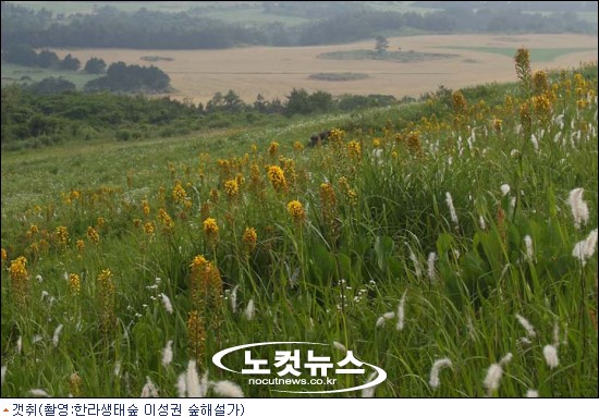 갯취의 '갯'은 바닷가를 뜻하고 '취'는 나물을 뜻하므로 '바닷가에 나는 나물'이라 할 수 있습니다. 실제로 나물로 식용하기도 한다고 합니다. 그리고 갯취의 학명이 Ligularia taquetii Nakai입니다. 속명 Ligularia는 라틴어 ligula에서 유래한 것으로 작은 설상화가 달린다는 뜻이라고 합니다. 국화과 식물이면 설상화가 있겠지만 곰취나 갯취 등 곰취속 식물들은 비교적 설상화의 개수가 적어 듬성듬성 달립니다. 그리고 종소명 taquetii는 20세기 초 제주의 식물을 세계에 알렸던 타케신부를 기리기 위해 붙여졌습니다. 타케신부가 제주에서 생활하면서 채집한 수만 점의 식물표본이 유렵의 대학과 박물관에 전해짐으로써 세계에 알려졌던 일은 유명합니다. 이 시기가 한국의 식물학계에도 가장 큰 발전을 가져왔던 때로 기억될 만큼 타케신부가 미친 영향은 크다고 할 수 있습니다. 디지털카메라가 보편화 되면서 식물애호가들의 활동으로 인해 세상에 알려지는 식물들이 많은데 갯취가 그 가운데 하나일 것입니다. 그 영향 때문인지 최근 갯취를 관상용으로 이용하려는 사람들이 많아졌습니다. 잎이 커서 식물원의 지표식물로 이용되기도 하고 화단의 식재용으로 재배되기도 합니다. 9월쯤에 채취한 종자를 곧바로 뿌려주거나 이듬해 4월에 옮겨 심으면 됩니다. 척박하고 건조한 토양은 피하고 반그늘이나 햇빛이 많은 곳에 심어야 하고 적당한 비료와 습도가 유지되면 잎이 비교적 넓고 크게 자라서 관상 가치를 높일 수 있다고 합니다.  갯취가 장관을 이루며 피어있는 것을 본 사람들은 상당한 개체수가 있을 것이라고 생각할지도 모르겠습니다. 그러나 실상은 그렇지 못합니다. 이것은 골프장이나 목장 건설로 자생지가 없어지는 것이 가장 큰 이유가 될 것입니다. 그리고 갯취가 꽃가루받이가 되도 씨앗을 잘 맺지 않는 성질을 가지고 있어 개체수가 늘어나지 않는 것도 한 몫을 하고 있을 것입니다. 그래서 법으로 보호하고 있기도 하고 몇몇 단체들의 복원 노력이 있기는 하지만 시원치 못한 듯합니다. 여기에 대해 관련기관의 좀 더 체계적인 연구가 필요한 것이 아닌가 싶습니다. 초여름 새별오름을 오르다 만나는 갯취는 언제 봐도 환상적인 모습입니다. 저녁이면 산방산의 석양과 집어등을 밝힌 고깃배의 풍광을 함께 볼 수 있어 더할 나위 없습니다. 내년 여름 다시 멋진 모습을 보여줄 갯취가 기다려집니다.