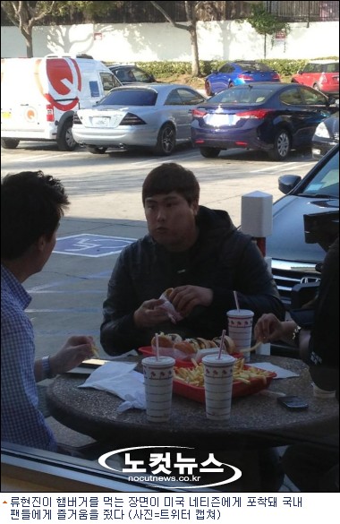 최근에는 SNS를 통해 올라온 사진 한장이 화제가 됐다. LA 다저스와의 계약을 마친 류현진이 한 햄버거 가게에서 햄버거를 먹고있는 장면이 미국의 한 네티즌에게 포착됐다. 류현진은 햄버거 1개를 손에 들고 있었고 테이블 위에는 3개가 더 놓여 있었다.