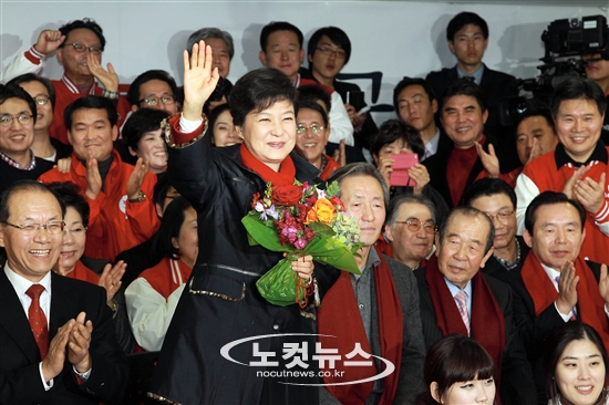 19일 실시된 제18대 대통령선거에서 당선이 확실시 되는 새누리당 박근혜 후보가 이날 밤 새누리당 당사 종합상황실을 찾아 캠프관계자로부터 축하를 받고 있다.