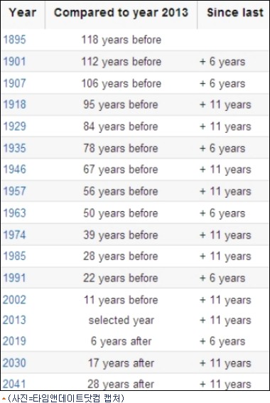 같은 달력이 나타나는 간격은 6년, 11년, 11년, 6년, 11년, 11년 등이 반복돼 2013년 달력과 같은 미래 달력이 다시 나타나는 시기는 6년 후인 2019년이다.