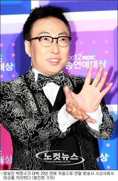 박명수는 29일, 서울 여의도 MBC방송센터에서 강호동, 광희, 강소라의 공동사회로 진행된 2012 MBC방송연예대상의 대상을 수상했다. 박명수가 연말 시상식에서 대상을 받은 것은 지난 1993년 데뷔 이후 처음이다.