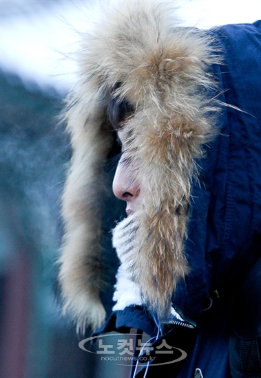 서울의 기온이 영하 16도까지 전국 대부분 지역에 한파 특보가 내려진 3일 오전 서울 광화문 네거리에서 신호를 기다리는 한 시민이 입김을 내뿜고 있다. 기상청은 이번 맹추위가 주말까지 계속되다 일요일 낮부터 조금씩 누그러질 것으로 전망했다.