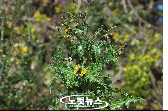 며칠 풀리던 날씨가 어제부터 기온이 많이 내려갔습니다. 한라산에도 다시 눈이 내리면서 횡단도로를 달리는 차들은 거북이 걸음입니다. 올 겨울 업무 때문에 서귀포로 출근 하고 있는 탓에 눈 쌓인 풍경은 매일 보고 있는 셈입니다. 그러나 제주도는 중간에 한라산이 있어 지역마다 날씨가 조금씩 달라 동부지역에 비가 내리는 날에도 서부지역에는 그렇지 않을 때가 많습니다. 요즘처럼 눈이 많은 날에도 제주시와 달리 서귀포는 비교적 포근한 편입니다. 이런 날씨 때문에 몇몇 들꽃들은 꽃을 피운 채 겨울을 나기도 합니다. 서귀포 바닷가에는 아직도 감국이 꽃을 피우고 있고 주변 풀밭에도 별꽃, 큰개불알풀이 한창입니다. 그리고 길 건너 텃밭에는 이름도 재미있는 방가지똥이 추운 겨울이지만 씩씩하게 꽃대를 올렸습니다.