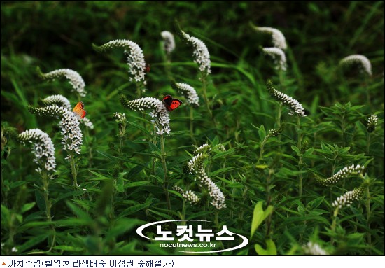 까치수영의 꽃말이 '잠든 별'입니다. 꽃을 자세히 보면 많은 별들이 모여 반짝이는 것처럼 보입니다. 그런데 낮에는 별이 빛날 수 없기 때문에 잠을 자고 있다고 느꼈던 모양입니다. 꽃말에서 순박한 동심이 느껴집니다. 그래서 까치수영의 또 다른 꽃말을 '동심'이라 한 모양입니다. 까치수영은 바닷가 풀밭에서부터 오름의 언저리까지 어디에서나 흔히 볼 수 있어 정감이 더 가는 꽃입니다. 그리고 유독 까치수영의 꽃에는 많은 나비나 벌들이 앉아 있는 것을 볼 수 있습니다. 화려하지는 않지만 소박한 아름다움 때문에 눈길을 한 번 더 주는 것은 사람이나 곤충이나 매한가지인 듯합니다.