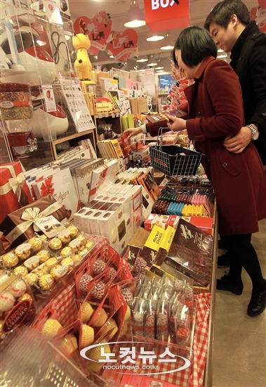 밸런타인데이를 하루 앞둔 13일 오후 서울 명동에서 시민들이 연인에게 선물할 초콜릿을 고르고 있다.