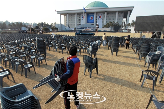 제18대 대통령 취임식을 닷새 앞둔 20일 오후 국회광장에 참석자 7만명이 앉을 의자가 놓이고 있다.