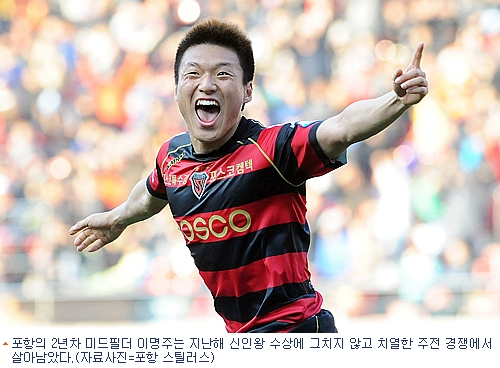 프로축구 포항 스팉러스의 2년차 미드필더 이명주(23)는 지난해 신인왕이다. 그러나 지난 시즌 신인 선수들의 활약이 크게 눈에 띄지 않은 탓에 5골 6도움을 기록한 이명주의 수상은 큰 주목을 받지 못했다.