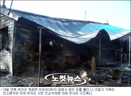 16일 오후 3시 10분께 전북 부안군 계화면 이모 씨(84)의 집에서 원인 모를 불이 났다. 불은 이씨의 집과 가재도구를 모두 태우고 30분 만에 진화됐다.