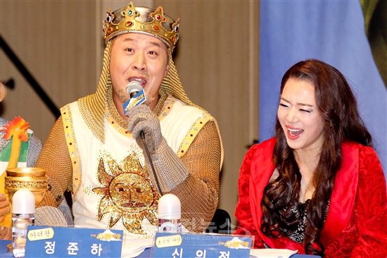 개그맨 정준하가 18일 오후 서울 종로구 세종로 광화문 올레스퀘어에서 열린 뮤지컬 '스팸어랏' 제작발표회에서 개인기를 하고 있다.
