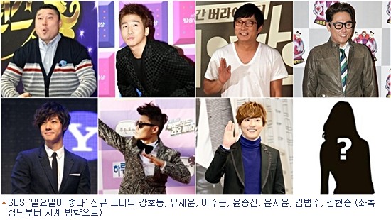 강호동이 필두로 나서는 SBS 예능프로그램 '일요일의 좋다'의 새 코너에 유세윤, 김범수, 이수근, 윤종신, 김현중, 윤시윤이 출연할 전망이다.