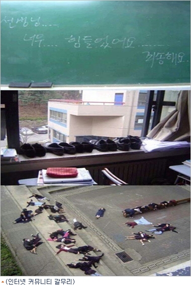 서울의 한 고등학교 학생들은 칠판에 "선생님, 죄송해요"라는 글을 써두고 활짝 열어둔 창문 앞에 신발을 가지런히 벗어뒀다.
