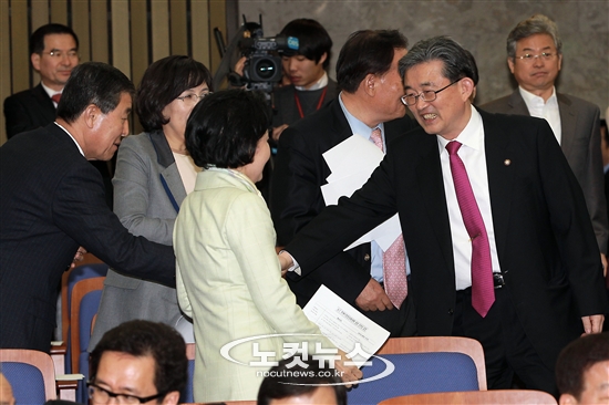 새누리당 이한구 원내대표가 11일 오후 국회에서 열린 의원총회에 참석하며 동료의원들과 인사나누고 있다.