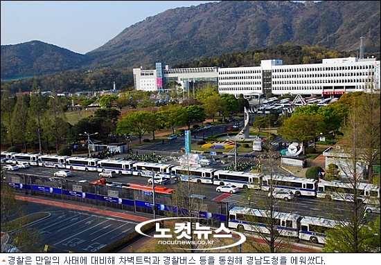 경찰은 만일의 사태에 대비해 차벽트럭과 경찰버스 등을 동원해 경남도청을 에워쌌다.