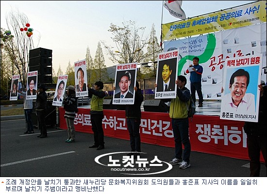 조례 개정안을 날치기 통과한 새누리당 문화복지위원회 도의원들과 홍준표 지사의 이름을 일일히 부르며 날치기 주범이라고 맹비난했다.