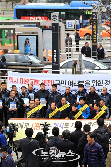 전국택시노조, 전국민주택시노조, 전국개인.일반택시운송사업조합연합회 등 이상 4개 단체 회원들이 15일 오전 서울역에서 4월 임시국회 내 '대중교통의 육성 및 이용촉진에 관한 법률 일부개정법률안(이하 대중교통육성법안)'의 재의결을 촉구하며 기자회견을 갖고 있다.