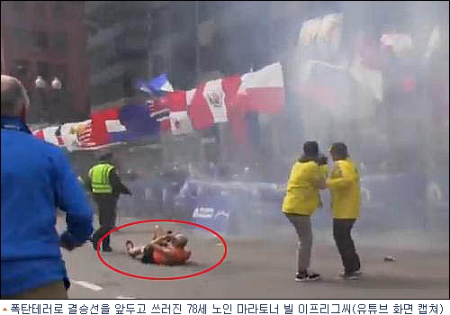 올해 78세인 노인 마라토너인 빌 이프리그는 폭발 현장에서 가장 가까운 거리에서 달리다 쓰러져 보는 이들을 안타깝게 했다.