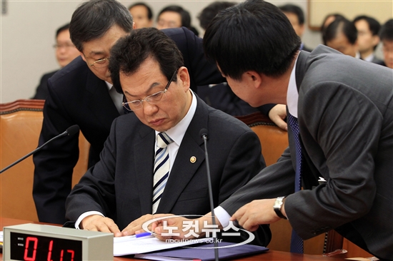 서남수 교육부 장관이 22일 오후 서울 여의도 국회에서 열린 법제사법위원회 전체회의에서 보좌진들과 함께 자료를 검토하고 있다.