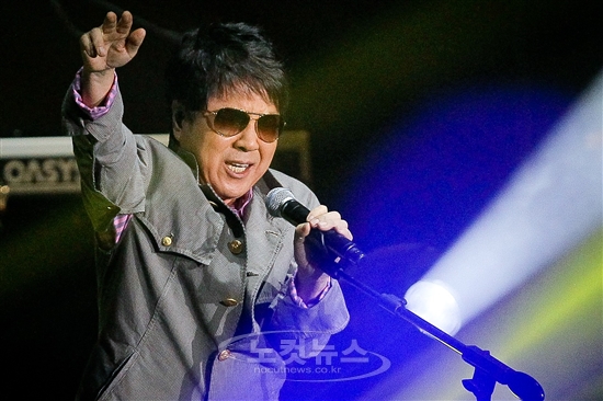 가수 조용필이 23일 서울 방이동 올림픽공원 내 올림픽홀에서 열린 19집 앨범 `헬로(Hello)` 발매 기념 쇼케이스에서 신곡 '바운스(Bounce)'를 열창하고 있다