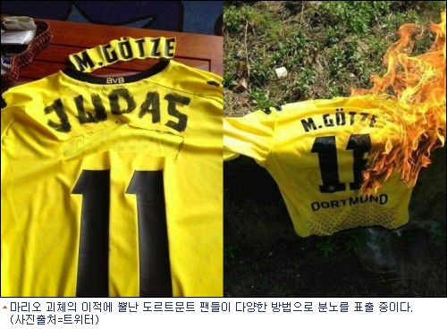 도르트문트의 유니폼에서 괴체의 이름을 잘라 버리고 그 자리에 ‘유다’라는 이름을 적거나 유니폼을 태우는 등의 행동으로 분노를 표출하는 팬들의 모습도 포착됐다. 트위터를 통해 퍼지고 있는 이 사진들은 전 세계 축구 팬들 사이에서 화제다. 도르트문트 팬들의 분노는 여기서 그치지 않았다. 괴체의 어린 동생은 학교에서 괴롭힘을 당해 조퇴를 해야 했고, 그의 집은 팬들에 의해 스프레이 낙서로 도배 되고 있다. [BestNocut_R]