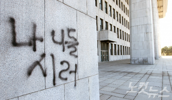 지난 10월 26일 저녁 서울 소재 대학생 두 명이 서울 여의도 국회 본청 기둥에 검은색 래커로 '나 니들 시러(싫어)'라고 낙서를 했다 (사진=윤성호 기자)