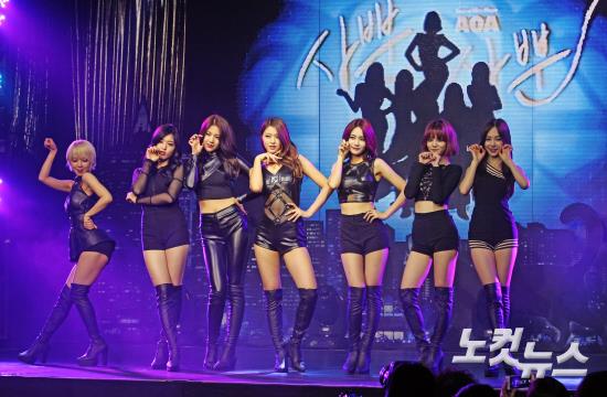 걸그룹 AOA(혜정, 유나, 초아, 민아, 설현, 찬미, 지민)가 10일 오후 서울 마포구 예스24 MUV홀에서 열린 두번째 미니앨범 '사뿐사뿐' 발매 기념 쇼케이스에서 포즈를 취하고 있다.