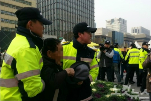 지난 11일, 세월호 농성장을 난입해 고함을 지르던 어버이연합 회원이 경찰에 끌려나가고 있다.