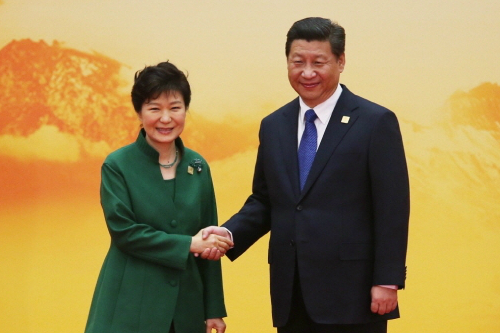 박근혜 대통령이 11일 오전(현지시각) 중국 베이징 옌치후 국제회의센터(ICC)에서 열린 APEC 정상회의에 참석, 시진핑 국가주석과 악수하고 있다. (사진=청와대 제공)