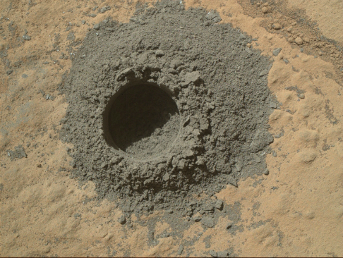 화성탐사로봇 큐리오시티가 토양샘플 채취를 위해 뚫은 드릴 흔적 (사진=NASA)