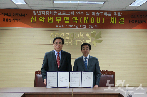 이번 협약은 동국대 경주캠퍼스와 한국문화정보센터가 청년직장체험프로그램 연수 및 학술교류 등 두 기관의 산학연계 발전을 도모하기 위해 마련됐다.