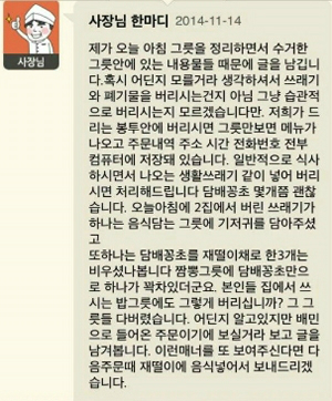 ◇ 박재홍> 또 인터넷에 잘못된 댓글이 하나 올라가면 이것이 아예 사장님의 이미지가 되어버리니까… 다음에 그분이 주문하시면 그 쓰레기 버리지 말아달라고 말씀하시면 좋겠는데 뭐라고 얘기하실 거예요, 만약에 그 분이 주문을 또 하시면?