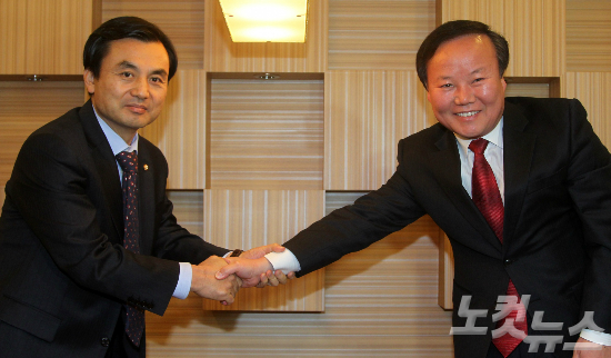 김재원 새누리당 원내수석부대표와 안규백 새정치민주연합 원내수석부대표가 27일 오후 서울 여의도의 한 식당에서 누리과정 예산과 관련해 회동하고 있다. (사진=윤창원 기자)