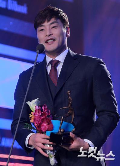 1일 오후 서울 서대문구 그랜드힐튼호텔에서 열린 '2014 현대오일뱅크 K리그 대상'에서 베스트11 골키퍼 부문에 선정된 권순태(전북 현대) 소감을 말하고 있다.