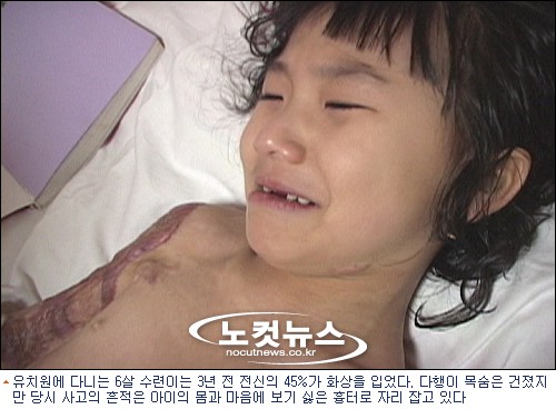겨우 목숨은 건졌지만 턱과 양팔, 허벅지, 사타구니 등에 심한 화상을 입어 견딜 수 없는 고통의 날들을 보내야 했다. 그 고통은 쉽게 사라지지 않았다. 3년이 지난 지금까지 사고의 흔적은 아이의 몸에 보기 싫은 흉터로 자리 잡고 있다. [BestNocut_R]