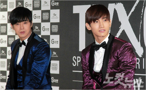 동방신기 유노윤호와 최강창민(오른쪽)이 7일 오후 서울 송파구 올림픽공원 체조경기장에서 열린 '동방신기 스페셜 라이브 투어(TVXQ! SPECIAL LIVE TOUR-T1STORY-IN SEOUL) 기자회견에서 취재진의 질문을 듣고 있다. 박종민기자