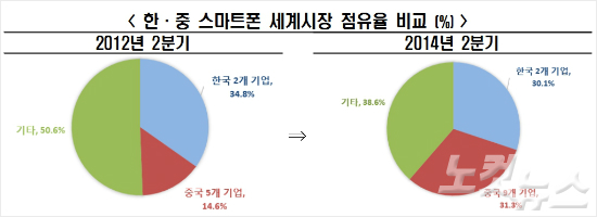 스마트폰은 올해 2분기 판매량 기준으로 한국이 중국에 1.2%포인트 뒤졌다.