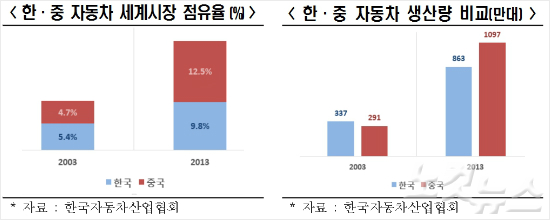 2003년까지만 해도 한국의 생산량은 337만대, 세계시장 점유율은 5.4%로 중국의 291만대, 4.7%보다 우위에 있었다.