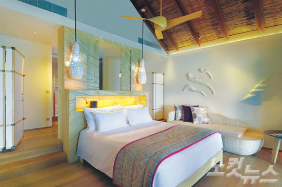 섬 중앙의 숲길에는 비치빌라 24채가 줄지어 서 있다. 입구로 들어서자마자 좌측에는 세면장과 사워장이, 우측으로는 미니바와 옷장이 시야에 들어온다. 나무를 재료로 꾸며진 내부 인테리어가 다소 소박하지만 자연스럽다.