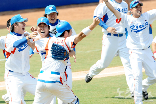 '일본 침몰' 2008년 베이징올림픽에서 한국 야구 대표팀이 일본과 4강전을 극적으로 승리한 뒤 기뻐하는 모습.(자료사진)