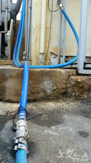 별다른 표시없이 색깔로만 구별해야 하는 황산저장탱크 호스(왼쪽 위)와 염산저장탱크 호스(오른쪽 위) .