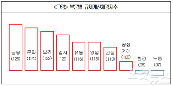 금융분야의 체감도가 126으로 가장 높았고 문화관광(124), 보건복지(122), 입지(120), 유통물류·영업(116), 건설(113), 공정거래(105) 순이었으며 환경과 노동분야는 98, 97로 기준치를 밑돌았다.