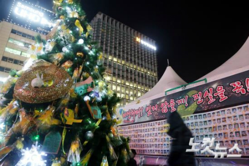 크리스마스 이브인 지난 24일 오후 서울 광화문광장 세월호 농성장에 걸린 영정사진 앞에 마련된 크리스마스 트리가 불을 밝히고 있다. (사진=윤성호 기자)