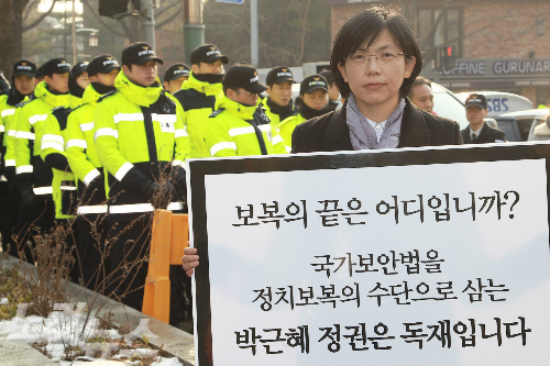 이정희 전 통합진보당 대표가 지난 24일 오전 서울 청운동 주민센터 앞에서 기자회견을 갖고 검찰이 국가보안법 위반 혐의로 당원들에 대한 수사를 진행하는 것에 대해 "보복은 저 하나로 끝내달라"고 밝히고 있다. (사진=황진환 기자)