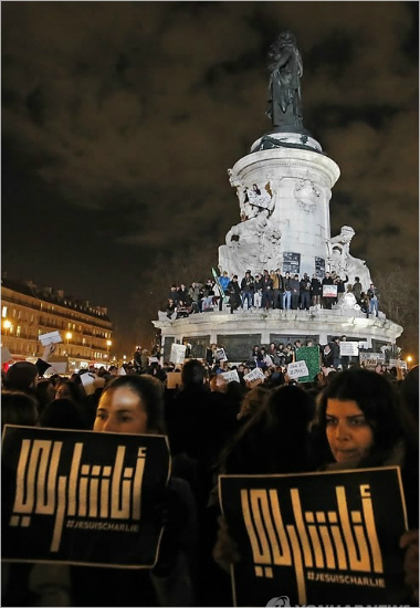 '샤를리 에브도' 테러를 규탄하는 프랑스 시민들이 8일(현지시간) 파리의 공화국광장에 모여 집회를 열고 있는 가운데 여성들(앞쪽)이 '나도 샤를리'라는 뜻의 아랍어 문구를 들어 보이고 있다.
