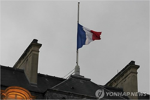 프랑수아 올랑드 프랑스 대통령이 8일(현지시간) 파리 엘리제궁에서 주간지 '샤를리 에브도' 테러와 관련한 긴급 각료회의를 소집한 가운데 엘리제궁에 프랑스 국기가 반기로 게양돼 있다.